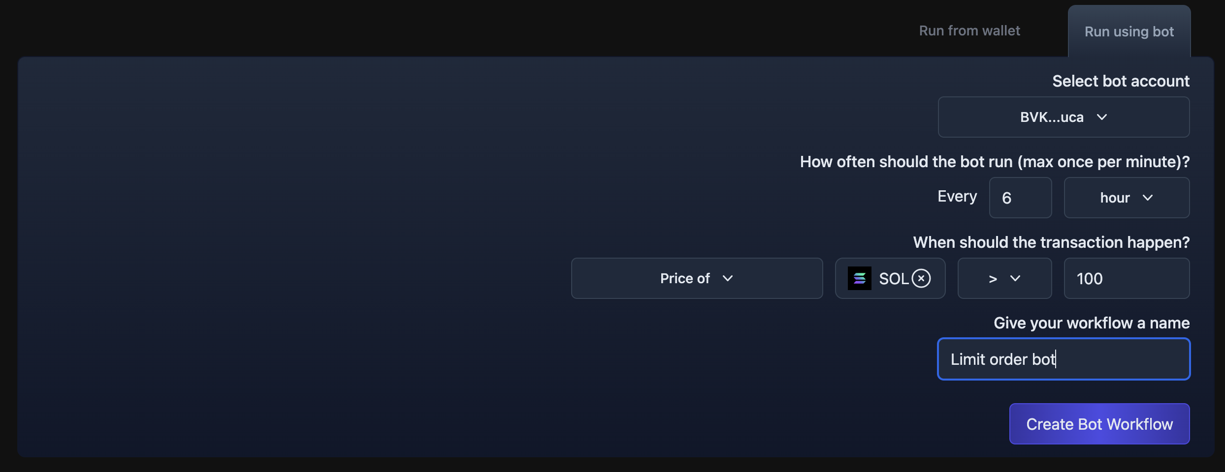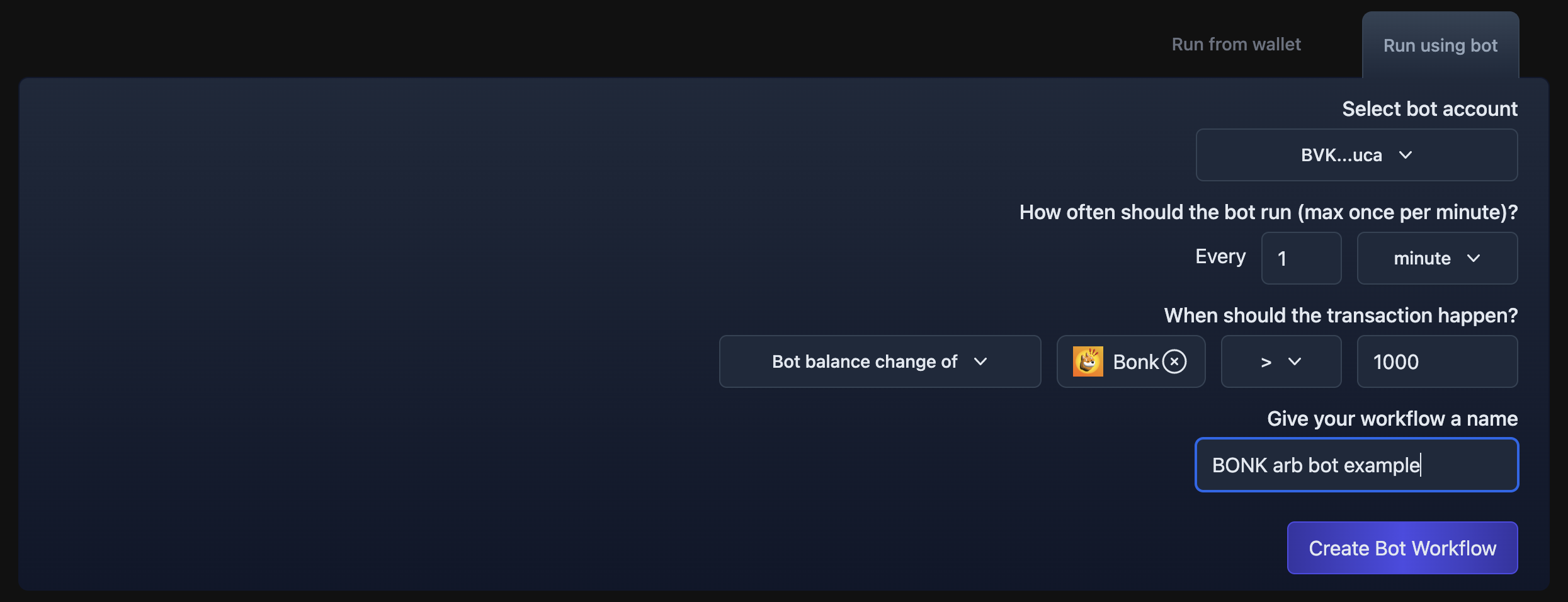 First create a bot account and fund it like before. Note that you only have to fund it with SOL as we're going to flash loan the BONK. Also note that you can use the same bot account for multiple workflows, no need to create multiple ones. But you can, if you want to split the funds for some reason.