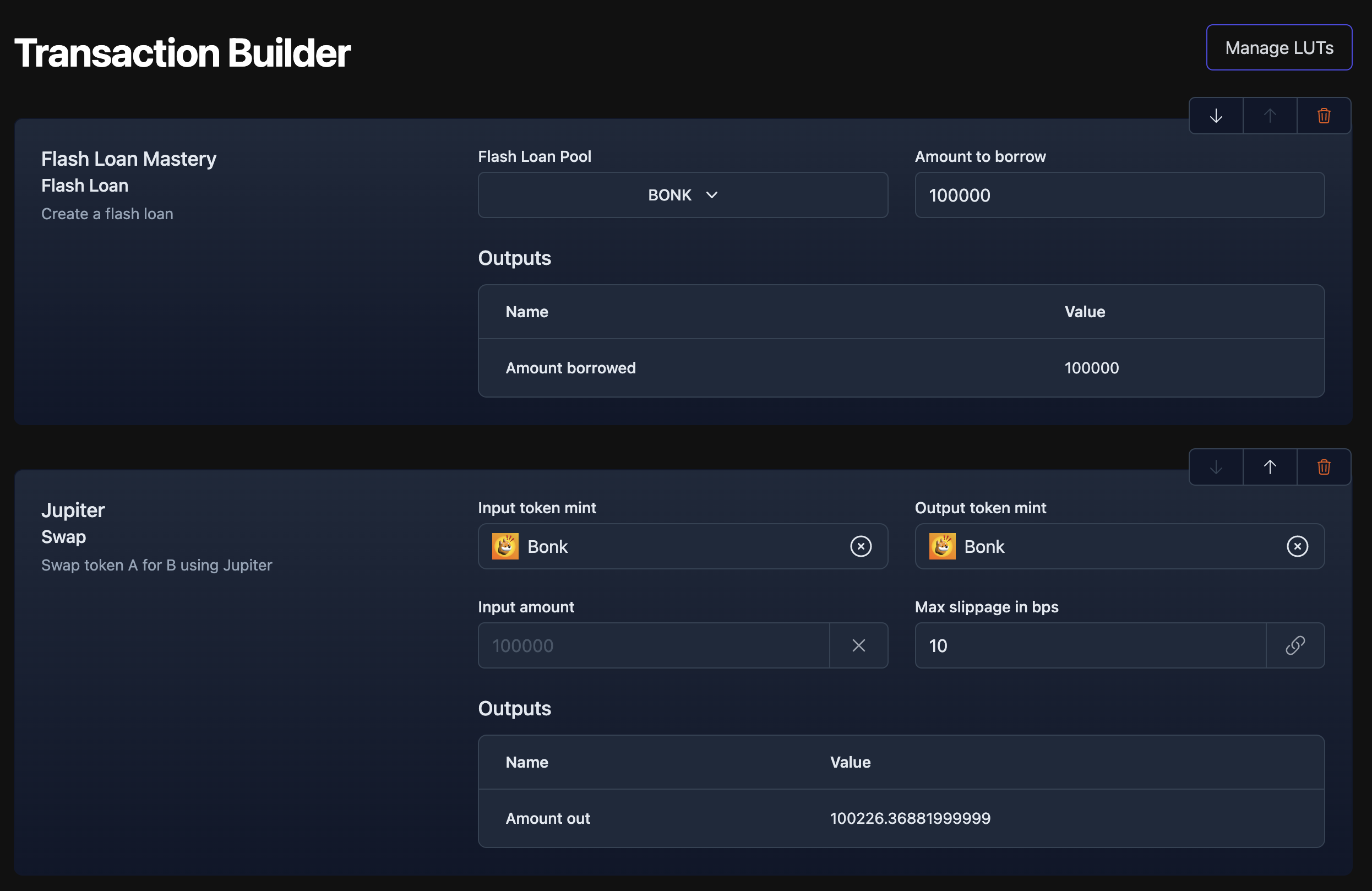 Create the workflow. First flashloan 100000 BONK and then swap BONK for BONK. If there is a profitable arb, the output should show that we get more BONK back.