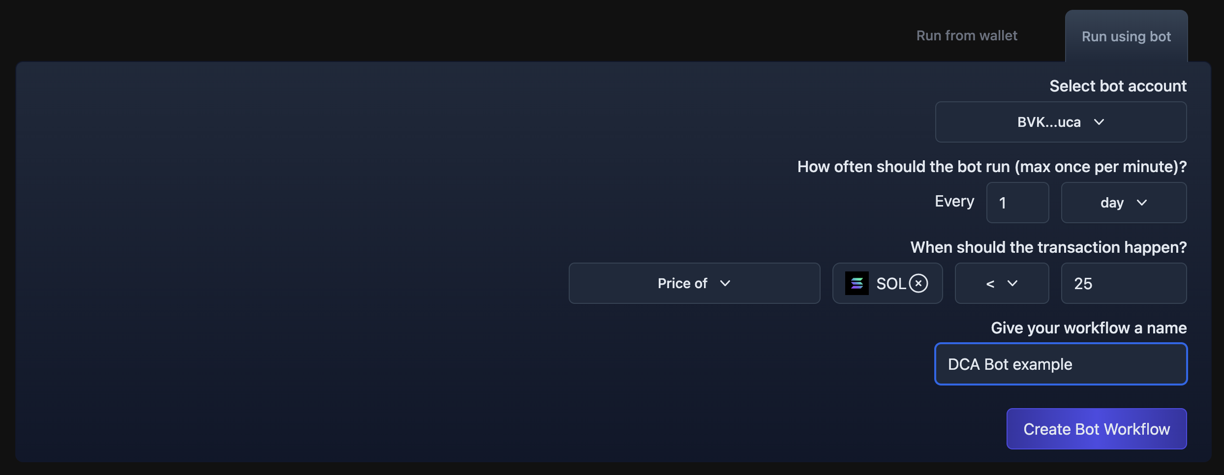 Suppose you want to Dynamic Cost Average (DCA) into a position slowly over time. At BYOB, you can create a workflow that swap for example $100 for SOL and then create a bot that executes this every day or every week, but only if $SOL < $25.